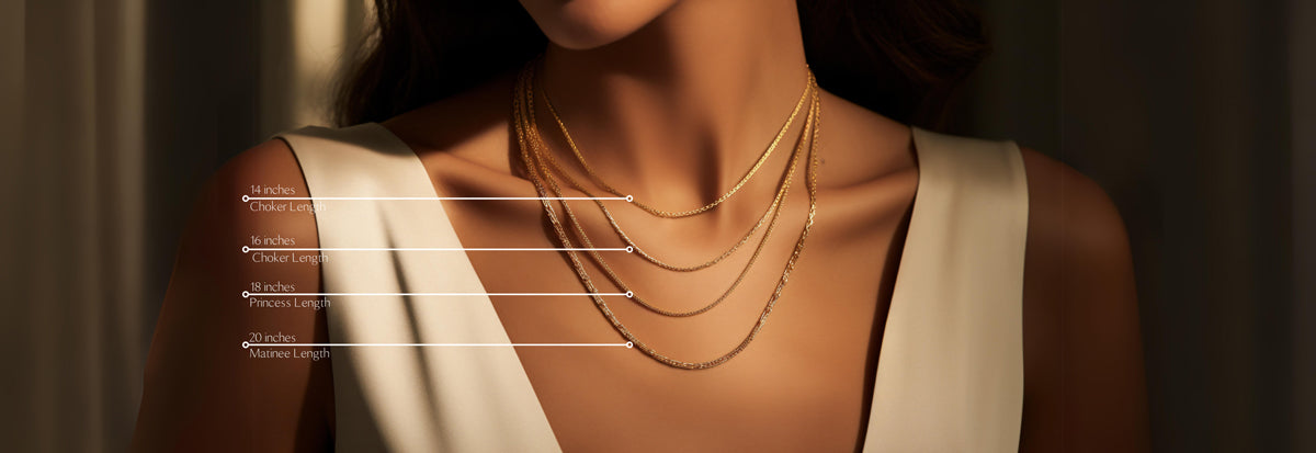 For non-custom necklaces or chains, there are industry-standard lengths available. There are six different lengths for women and Six for men. The standard sizes can be found in the table and model provided below.