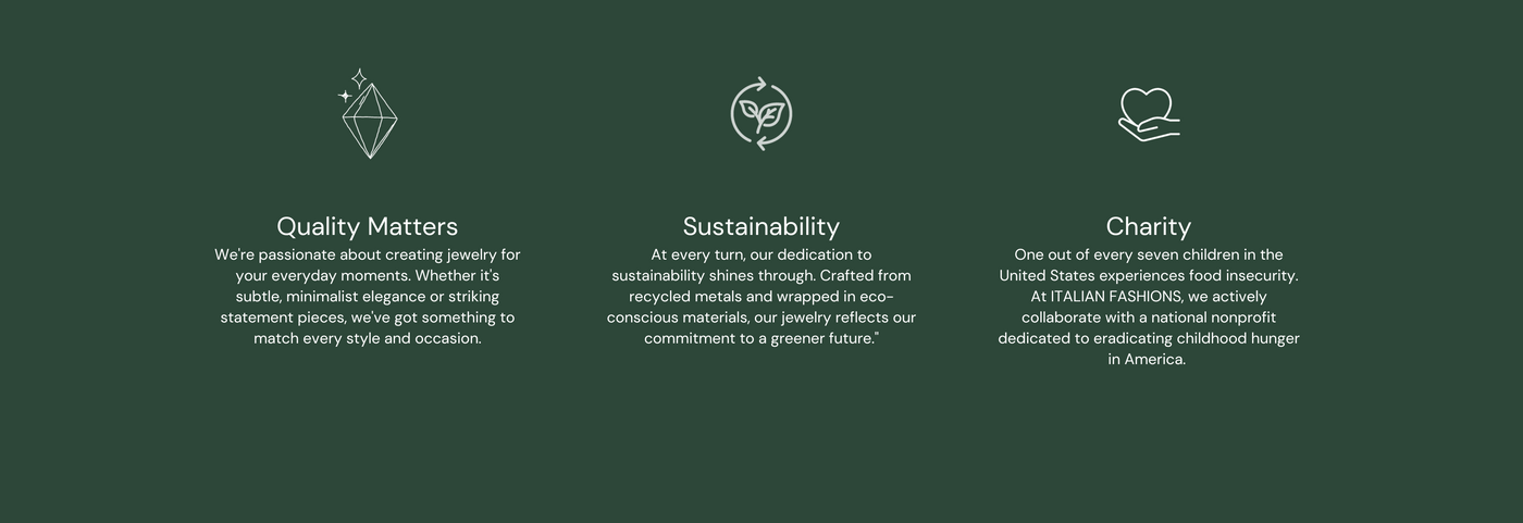 At Italian Fashions, our commitment to excellence goes beyond the products and services we offer. We embrace a set of core values that not only reflect our dedication to quality but also underscore our unwavering commitment to sustainability and social responsibility. These values form the foundation of our brand identity, setting us apart and making us a trusted choice for our customers. Explore the essence of Italian Fashions through our compelling brand values:
