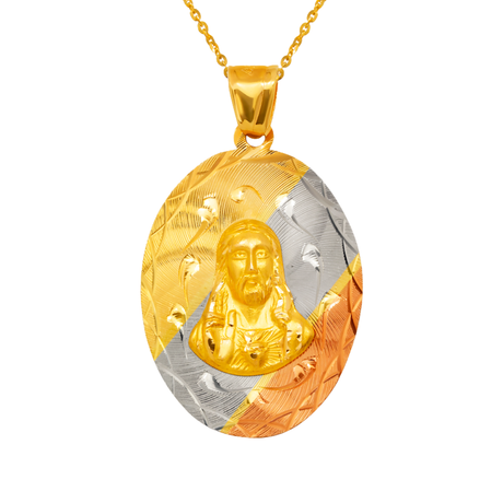 14K Yellow,Tricolor Gold Diamond Cut Oval Sacred Heart Scapular Pendant