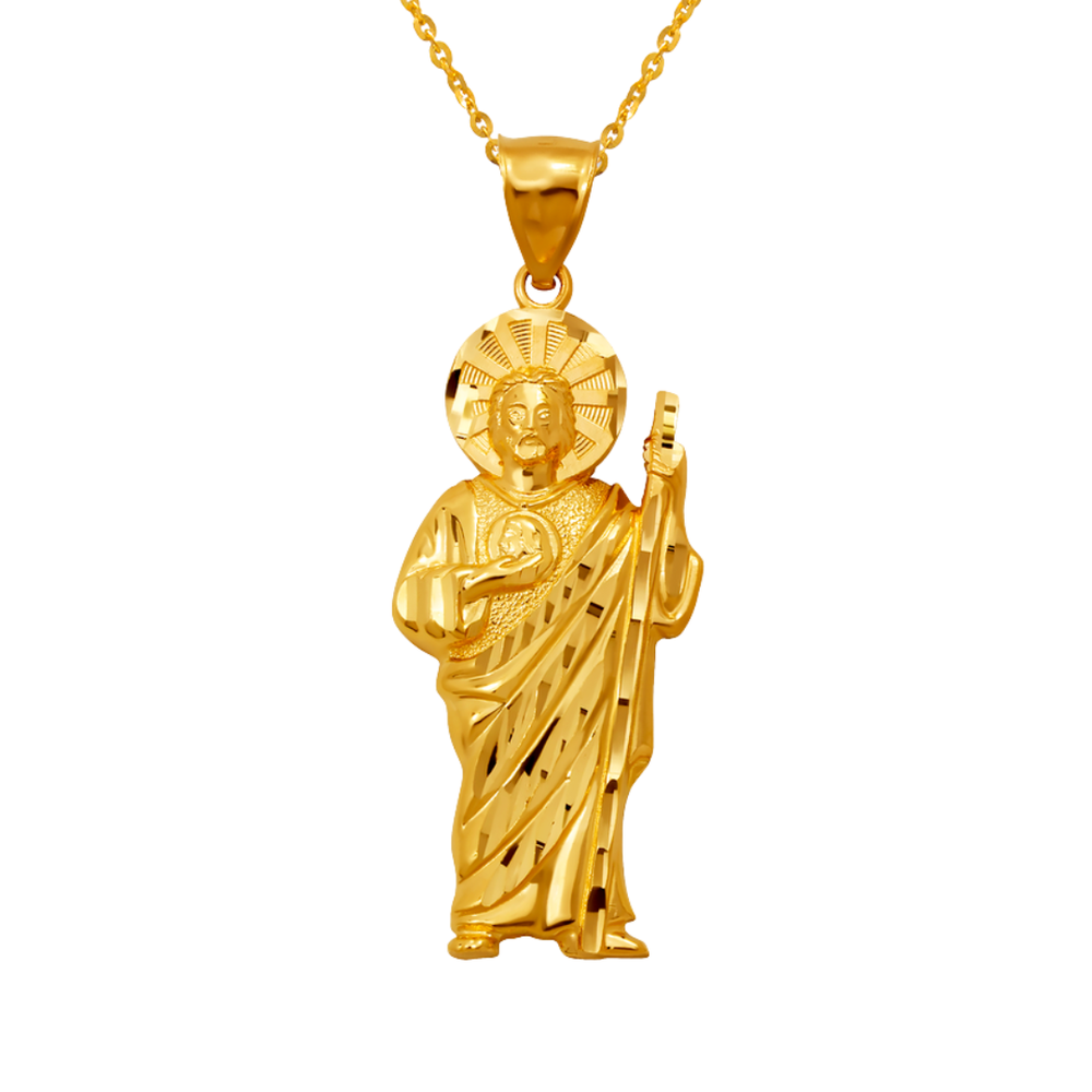 •   Real 14K Gold: Discover the elegance of this brand-new San Judas Pendant charm gold pendant crafted from genuine 14K Yellow gold. NOT Plated, NOT Filled, NOT Overlayed; This Pendant is professionally tested and stamped for 14K gold purity. Enjoy its remarkable durability and hypoallergenic properties.